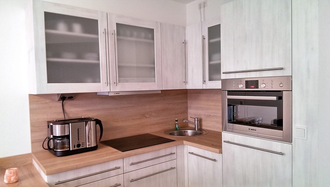 | Küche | Küchenzeile, Ceranfeld mit 4 Platten, Kühlschrank mit Gefrierfach, Backofen mit Mikrowelle, Geschirrspülmaschine, Kaffeemaschine, Wasserkocher, Toaster |